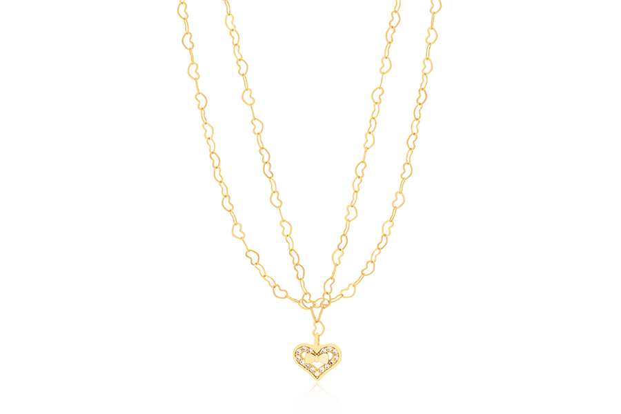 CHOKER BANHADA EM OURO, DUPLA, ELO CORAÇÃO 2,30mm LARGURA, 37cm COMPRIMENTO, EXTENSOR 10cm COMPRIMENTO E CORAÇÃO LAÇO 10mm LARGURA