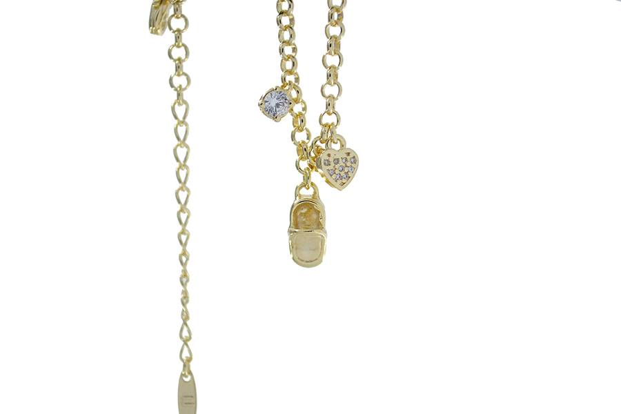 PULSEIRA INFANTIL BANHADA EM OURO, ELO CORAÇÃO 2,70mm LARGURA, 12cm COMPRIMENTO, CORAÇÃO LISO, ZIRCÔNIA E ANJO